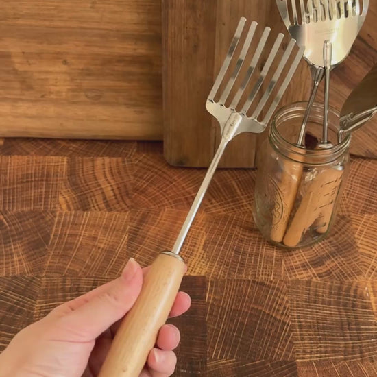 We're bringing back our favorite vintage metal spatula! It's sharp and flexible, perfect for slipping under fried potatoes, slicing up dumpling dough, and serving hot biscuits.